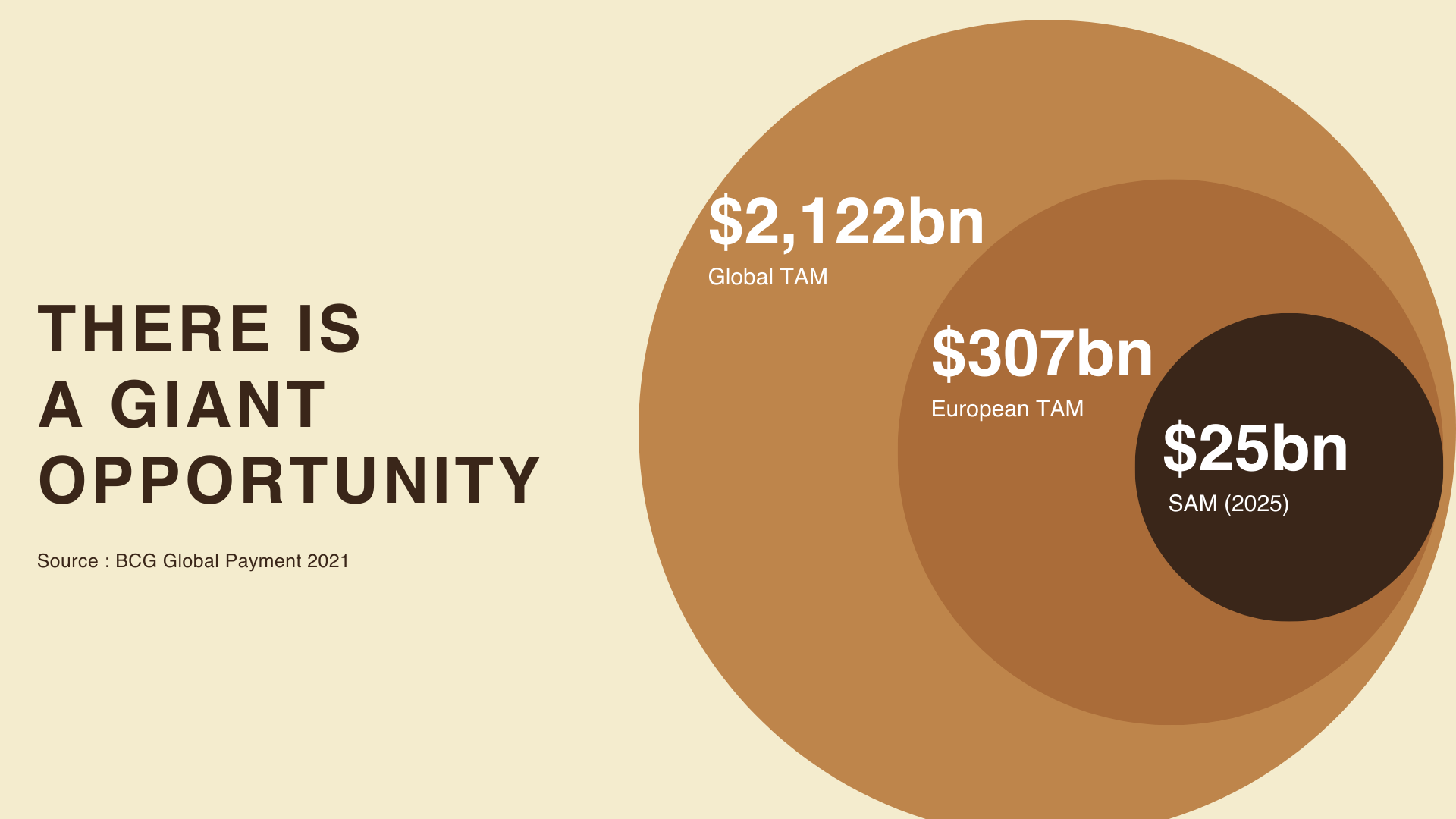 A oportunidade global de receitas provenientes de pagamentos está estimada em mais de $2trn. A nossa solução visa as indústrias de serviços, transportes e mercado retalhista na EMEA, primeiro a Ásia e Américas, o que nos dá uma oportunidade de SAM de $25 biliões de dólares.